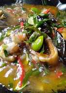 Tambahkan air secukupnya kemudian tunggu hingga mendidih. Lalu tambahkan santan garam gula daun bawang tomat belimbing wuluh cabai merah sereh dan daun salam. Tumis bumbu ulek masukkan cabai iris kemudian tambahkan garam kaldu bubuk dan gula merah.